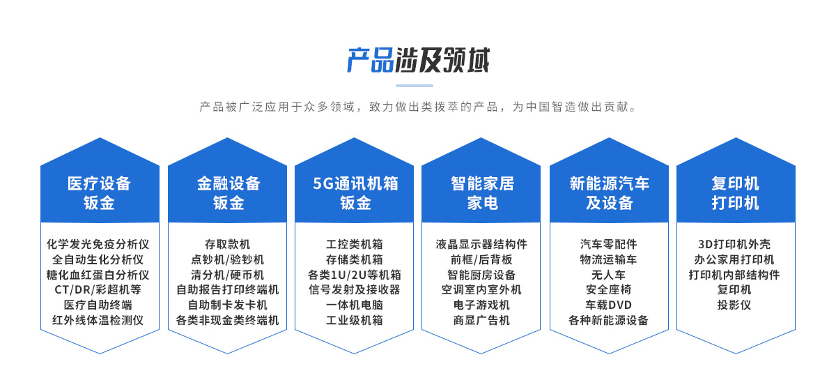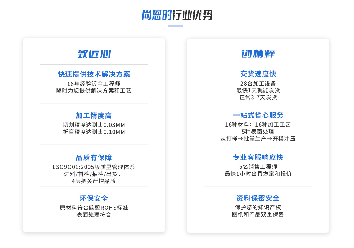 尚恩精密鈑金專注于高精度/高難度的精密鈑金件加工,包括各類精密鈑金結構件、精密異形鈑金件精密鈑金機箱、來圖定制、來樣定制、鈑金打樣及批量生產等,產品被廣泛應用于眾多領域。如:醫療設備領域,金融器具領域,打印復印機領域,5G通訊機箱領域,智能家居家電,新能源汽車及設備,電視機后背板,自動化機器人,車載影音及導航,各類彈片和屏蔽罩等,擅長制作各類異形凸包及特殊復雜形狀的鈑金件和結構件,產品被眾多客戶暢銷世界各地并得到認可與好評。
